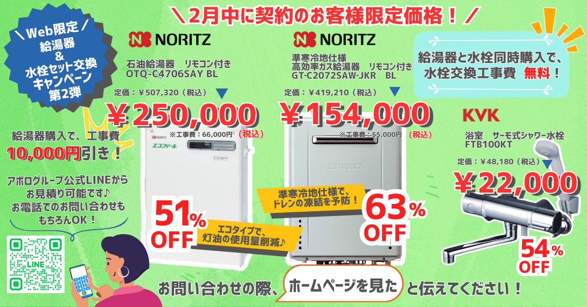 LPガスと灯油の供給販売・配送 安心安全の配送で快適な生活をお届けします 給湯器の販売・取付け工事 人気商品を驚きの価格でご紹介 ガステーブル・ガスコンロ・レンジフードの販売 お客様のキッチンに合う機器 保安監視システム〈APOLLO24〉 365日24時間ガスの安全を守ります ソーラーファームのご紹介 太陽光のエネルギーで電気をつくる ガス料金のご案内 ガス料金のしくみと、シミュレーション お客様Q&A 入退室ガスの手続きはどうしたらいい? アポログループ ブランドムービーAPOLLOGROUP BRAND MOVIE アポロ・スマイル アポロガス新CM 「ある夫婦の物語篇」 ブランドムービーコンセプト アポロのニュース&ブログ ガス 2026.02.02〈アポロガス〉Web限定!給湯器&水栓セット交換キャンペーン第2弾 家づくり 2026.01.31〈ほっとリビング〉おふろ祭り アポログループ 2026.01.19セッカクドーモ Vol.268 アポログループ 2025.12.24 〈アポログループ〉年末年始休業日のご案内 アポログループ 2025.12.22セッカクドーモ Vol.267 新電力 2025.12.16〈ふくしま新電力〉国による電気・ガス料金支援について 太陽光発電 2025.12.15〈アポロエナジー〉 あったかエアコンフェア 家づくり 2025.12.10〈ほっとリビング〉外壁・屋根塗装早期予約キャンペーン! 新電力 2025.12.08〈ふくしま新電力〉アポロのでんき冬のキャンペーン アポログループ 2025.11.20セッカクドーモ Vol.266 一覧を見る アポロガス お気軽にご相談下さい 受付時間:(日曜・祝日除く)午前8時30分~午後5時30分 24h WEBフォーム 会社概要 時間外連絡先