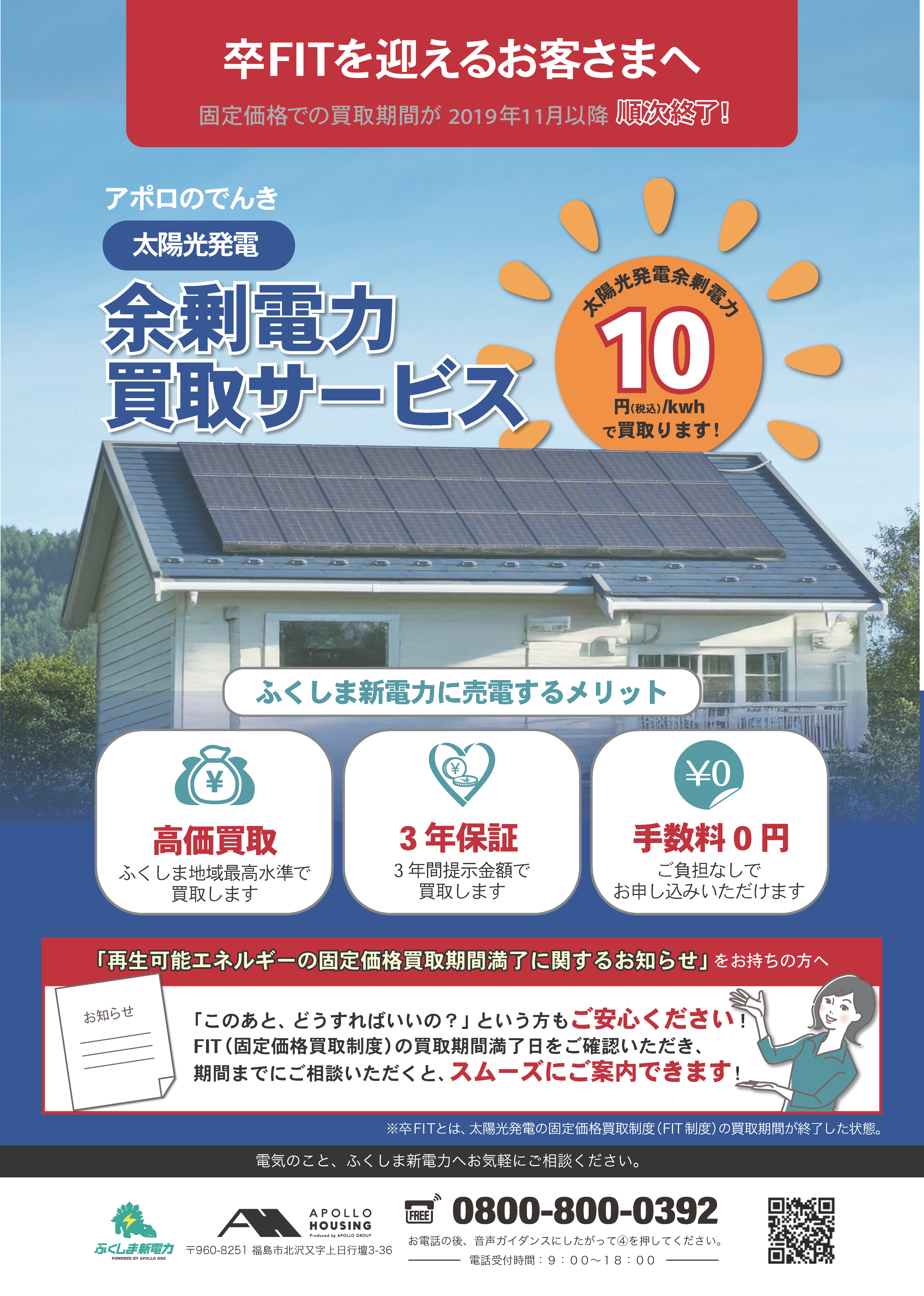 LPガスと灯油の供給販売・配送 安心安全の配送で快適な生活をお届けします 給湯器の販売・取付け工事 人気商品を驚きの価格でご紹介 ガステーブル・ガスコンロ・レンジフードの販売 お客様のキッチンに合う機器 保安監視システム〈APOLLO24〉 365日24時間ガスの安全を守ります ソーラーファームのご紹介 太陽光のエネルギーで電気をつくる ガス料金のご案内 ガス料金のしくみと、シミュレーション お客様Q&A 入退室ガスの手続きはどうしたらいい? アポログループ ブランドムービーAPOLLOGROUP BRAND MOVIE アポロ・スマイル アポロガス新CM 「ある夫婦の物語篇」 ブランドムービーコンセプト アポロのニュース&ブログ 新電力 2025.11.14〈ふくしま新電力〉卒FITを迎えるお客さまへ 家づくり 2025.11.10〈ほっとリビング〉住まいのホッと相談会 太陽光発電 2025.11.08〈アポロエナジー〉 エコキュート特価キャンペーン第3弾 ガス 2025.11.04〈アポロガス〉Web限定!給湯器&水栓セット交換キャンペーン アポログループ 2025.10.16セッカクドーモ Vol.265 新電力 2025.10.03〈ふくしま新電力〉アポロのでんき秋のキャンペーン アポログループ 2025.09.27セッカクドーモ Vol.264 アポログループ 2025.08.23セッカクドーモ Vol.263 アポログループ 2025.08.06 〈アポログループ〉夏季休業日のご案内 家づくり 2025.08.06〈ほっとリビング〉住宅リフォーム補助金キャンペーン 一覧を見る アポロガス お気軽にご相談下さい 受付時間:(日曜・祝日除く)午前8時30分~午後5時30分 24h WEBフォーム 会社概要 時間外連絡先
