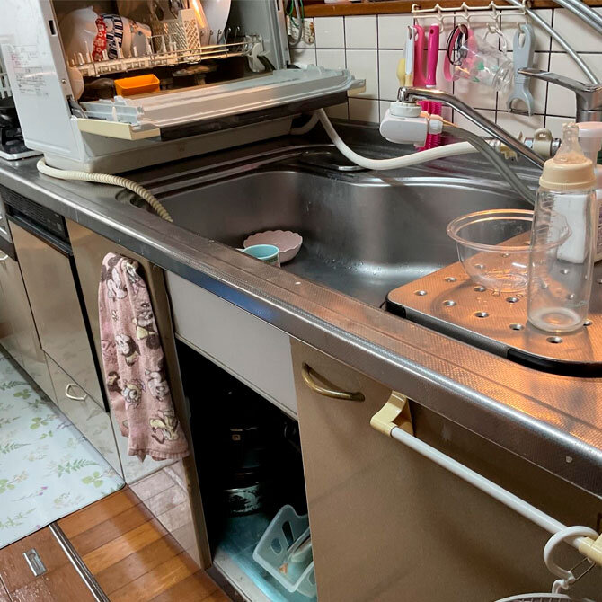 お孫さんが生まれるのをきっかけに、家事や料理がしやすい、安全で使い勝手の良いキッチンにしたいというご要望がありました。また、調理器具などの収納スペースが足りずゴチャゴチャしてしまっていたので、スッキリと片付くようにしたいというご要望がありました。