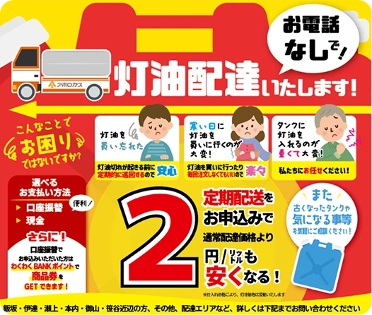 灯油の定期配送をお申込みいただくと通常配送より、2円も安くなります。お客様の使用状況を把握し、タンクが空になる前に定期的に配送させていただきます。